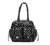 Quilted faux patent leather exterior. Inner and outer pockets for storage. Drawstring side pockets. Water resistant nylon lining. Matching changing pad included. Detachable Shoulder strap. Detachable coin purse inside