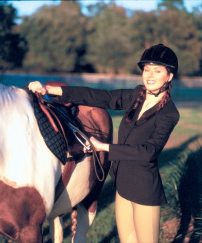 Tropical weight Poly/Wool/Lycra fabric is perfect for the show ring. Touch of lycra for just enough stretch across the back and arms. Enhanced fit and elegant drape for a traditional look. Classically tailored with double vents, notched lapels, fully lined, outside flap pockets and three button front. Reinforced buttons.